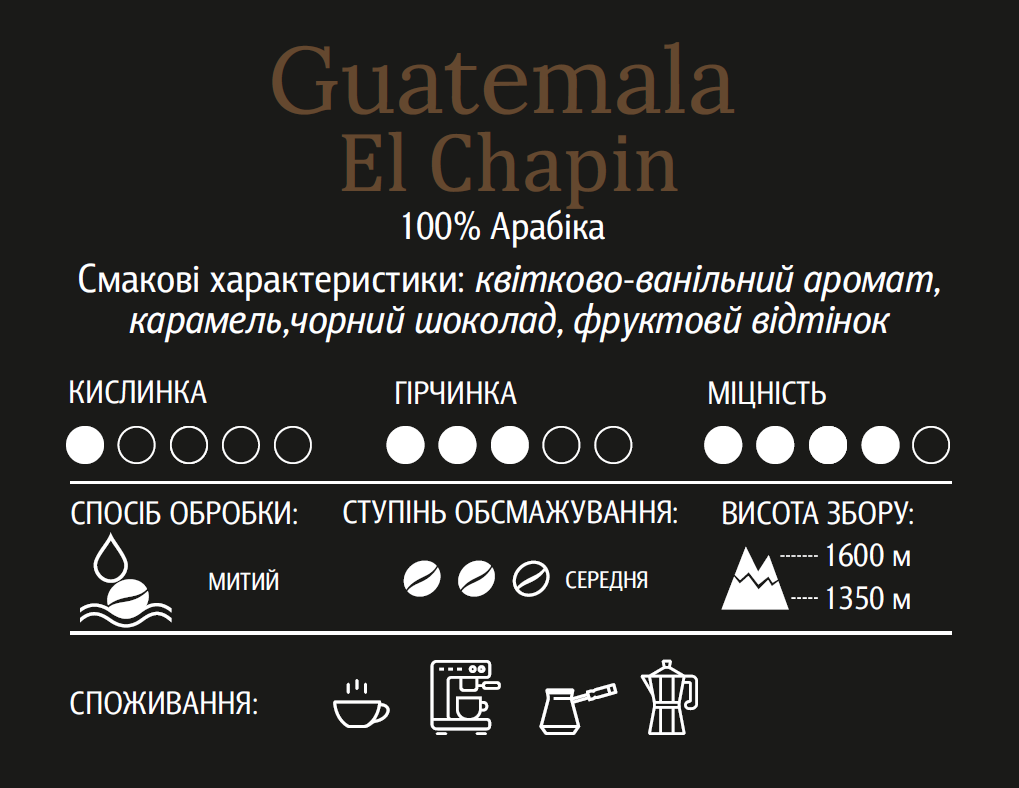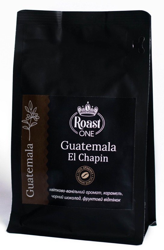 Guatamala El Chapin - 100% арабіка, моносорт середньої обсмажки, з приємною гірчинкою. СМАК:Кава з ароматом ванілі, післясмаком чорного шоколаду та ледь відчутною фруктовою кислинкою* (*це є натуральні відтінки смаку кави, кава не є ароматизованою). Для клієнтів, яким до вподоби міцна кава з цікавими смаковим букетом.