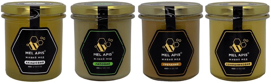 Сімейний сет меду Mel Apis "4L" (4x400 г) в корпоративній бурій гофроупаковці.